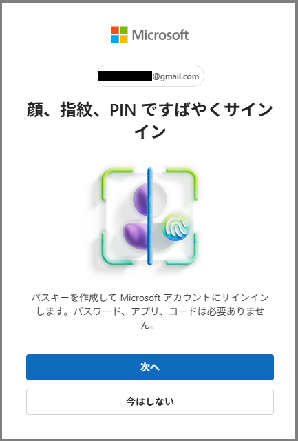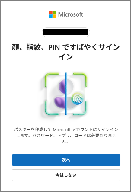 6. 顔認証、指紋認証、PINによるサインインを設定する場合は[次へ]を、設定しない場合は[今はしない]を選択します