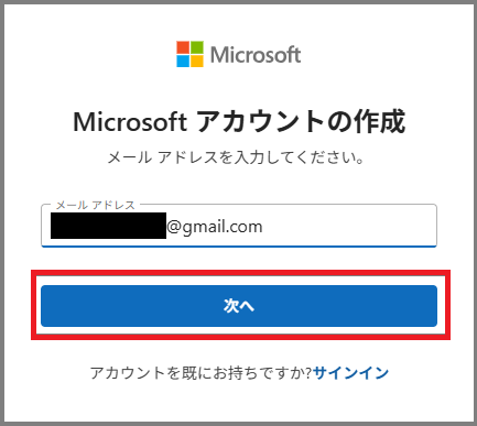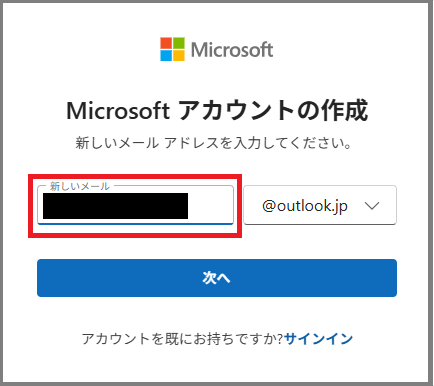 - Microsoftアカウント作成サイトにアクセスし、個人用Microsoftアカウントを作成するメールアドレスを入力し、[次へ]をクリックします