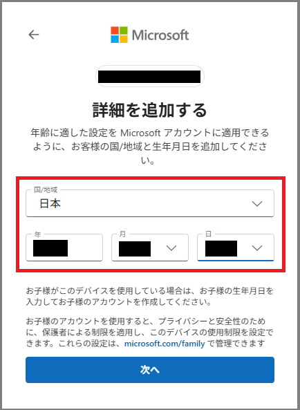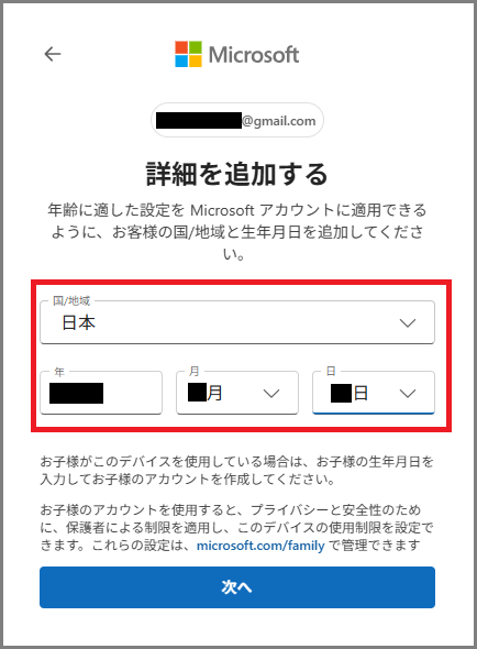 3. [国/地域] [年] [月] [日]を入力して[次へ]をクリックします