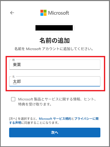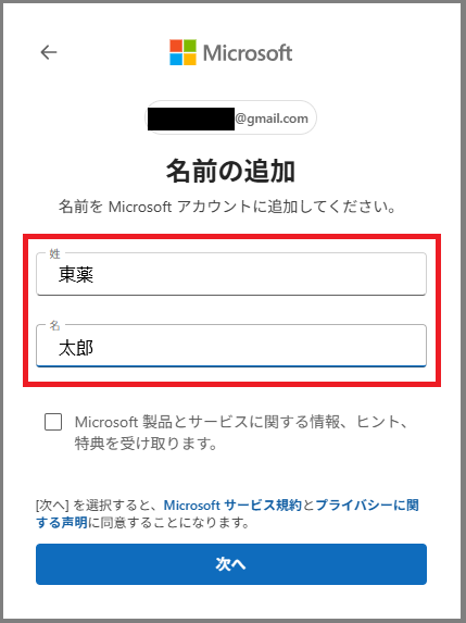 6. [姓] [名]の欄を記入し、[次へ]をクリックします