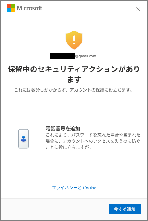 8. 電話番号を追加する場合は[今すぐ追加]、追加しない場合は右上の[ X ]マークをクリックして画面を閉じます