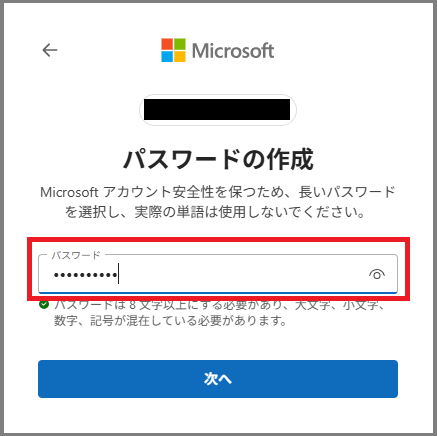 4.パスワード入力箇所に任意のパスワードを入力して[次へ]をクリックします