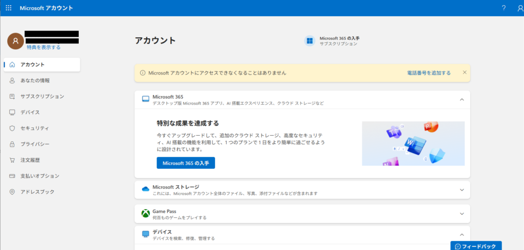 個人用Microsoftアカウントを作成した後は、[セキュリティ] → [サインイン方法の管理] から、バックアップメールアドレス、2段階認証などを設定してアカウントのセキュリティ強化を図る事をお勧めします。