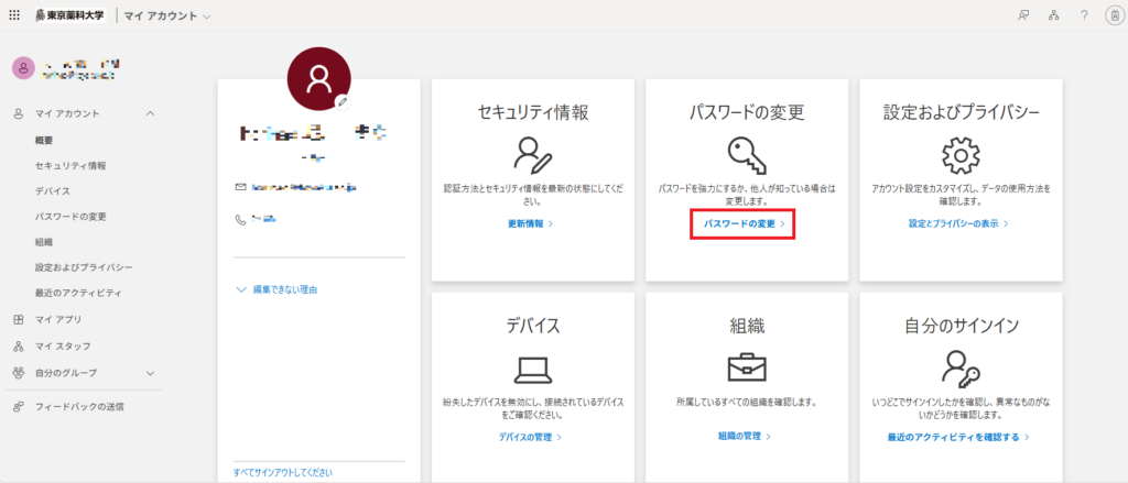 2. 「パスワードの変更」をクリックしてパスワード変更を行います。