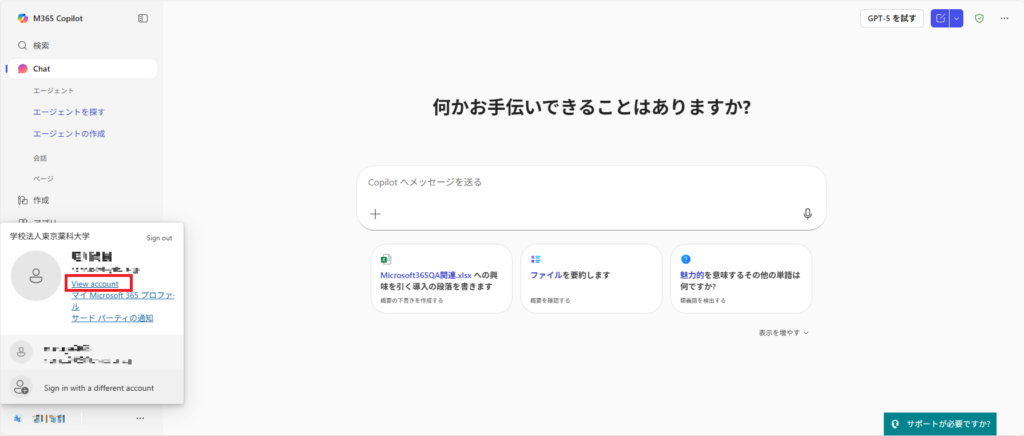 1. https://www.office.com/ にアクセスして、サインインを行い画面左下のアイコンから「アカウントの表示」を選択します。