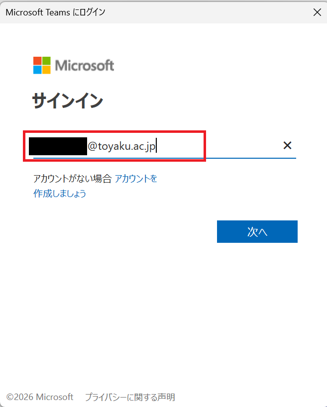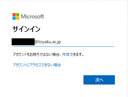 2. 大学のメールアドレスを入力し、[次へ]をクリックします。