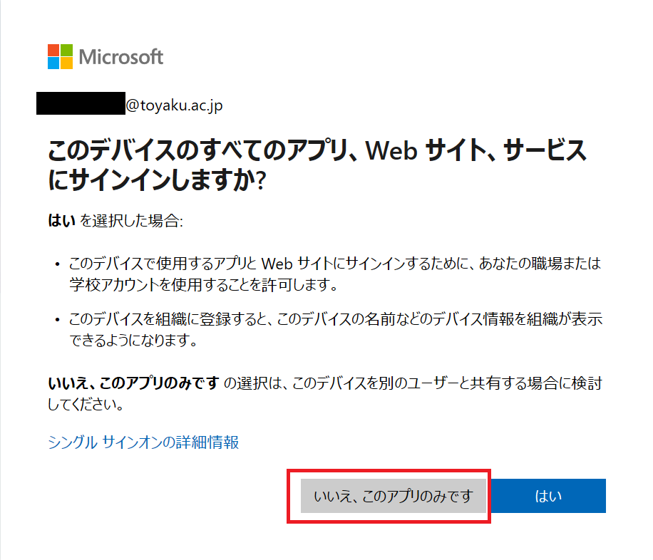 4. [いいえ、このアプリのみです]をクリックします。