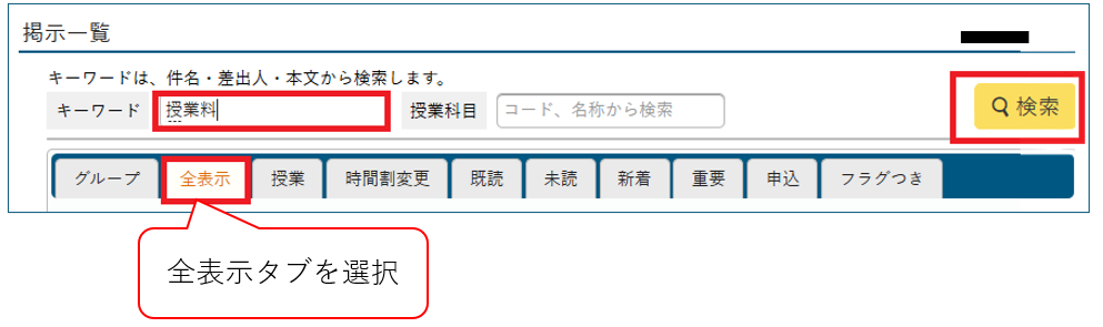 過去の掲示内容を検索したい時は、「全表示」タブを選択した状態で、「授業料」、「成績」などの検索したいキーワードを入力して、「検索」ボタンをクリックしてください。