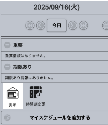 画面上部の「掲示板」というメニュー、あるいは中央左側の「掲示」アイコンをクリックしてください。