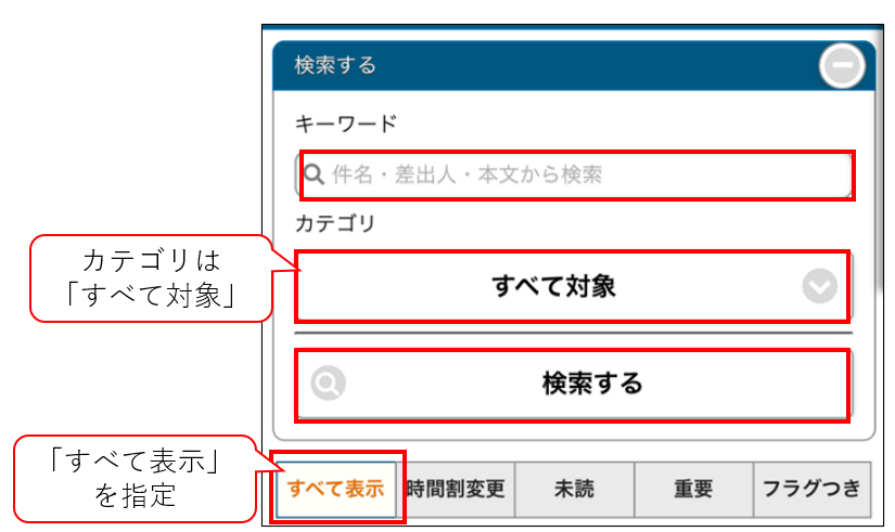 過去の掲示内容を検索したい時は、「授業料」、「成績」などの検索したいキーワードを入力して、カテゴリは「すべて対象」を指定、画面下部では「すべて表示」タブを指定した状態で、「検索」ボタンをクリックしてください。