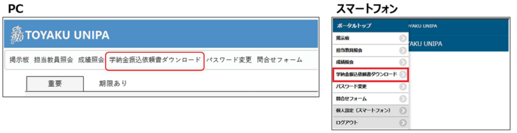 メニュー上の [学納金振込依頼書ダウンロード] をクリックしてください。