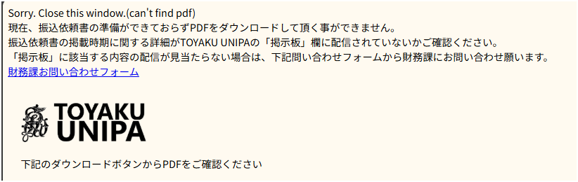 振込依頼書が掲載されていない理由について、TOYAKU UNIPA「掲示板」に該当する案内が掲載されていないかご確認ください。