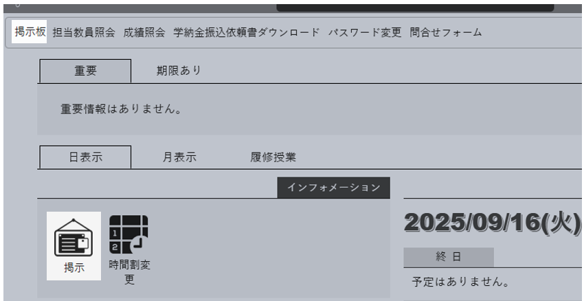 [成績照会]メニューは、成績公開期間中のみ表示されます。公開期間外にはメニューそのものが表示されません。